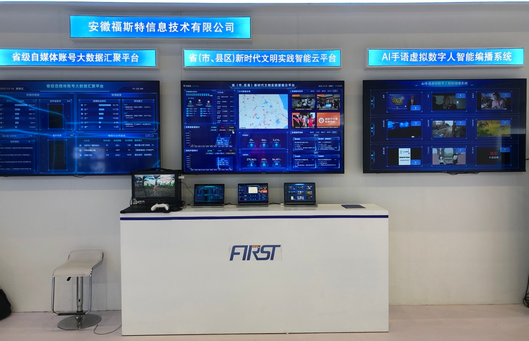 安徽福斯特信息技術有限公司此次應邀參展,以廣電媒體發展為亮點,集中展示大數據、人工智能呈現了AI-VLOG視頻智能合成系統+AI手語虛擬數字人智能編播系統+省級自媒體賬號大數據匯聚平臺+?。ㄊ?、縣區)新時代文明實踐智能云平臺技術。